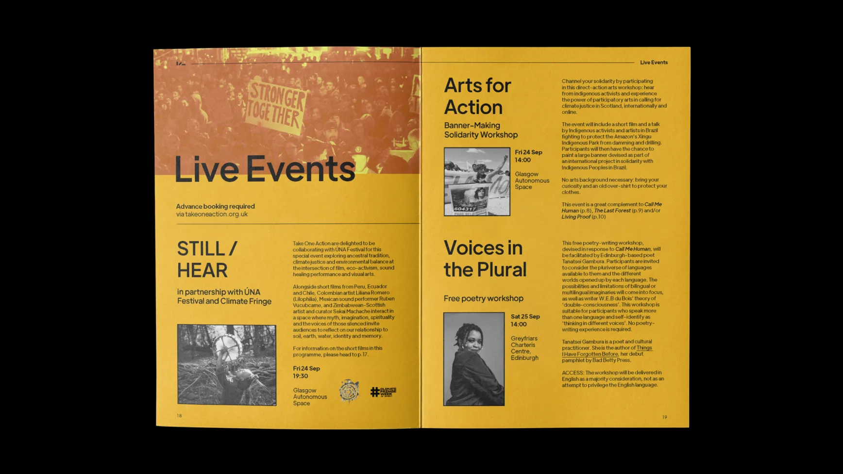 A Scottish film festival and year-round social-change organisation, Take  One Action explores global justice, community resilience, and sustainable futures through screenings, discussions, and grassroots film clubs. Since 2008, it has engaged audiences across Glasgow, Edinburgh, Dundee, and beyond in meaningful conversations about social and environmental issues.